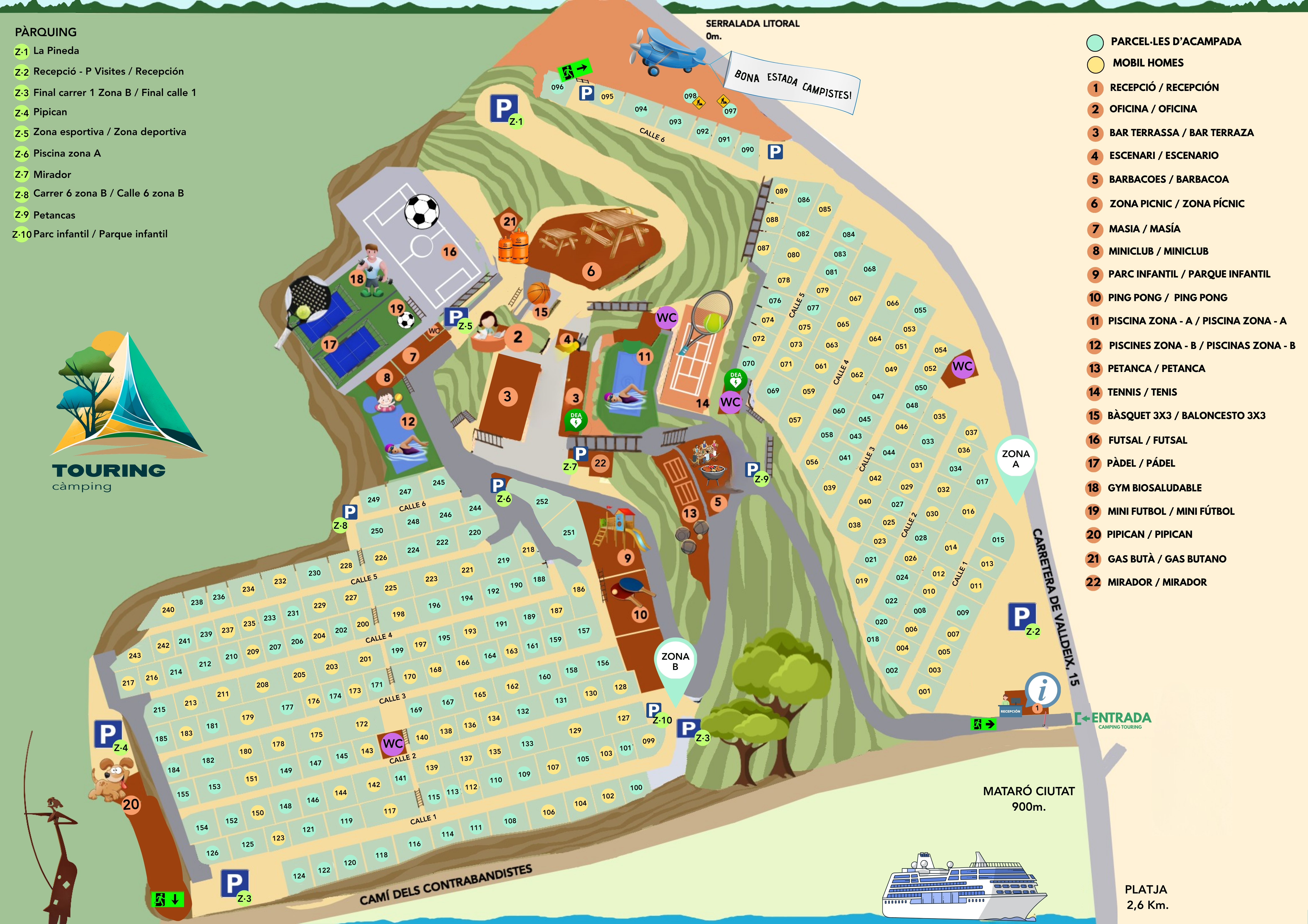 Parcel·les en primera línia, balconeres amb vistes al mar, de superfície d’entre 70 m2 i 140 m2, per caravanes, autocaravanes o campers, tendal o avancé, amb aparcament d’un vehicle a l’interior de la parcel.la o amb aparcament independent, ideals per els que busqueu millor vistes, més privacitat o més comoditat.